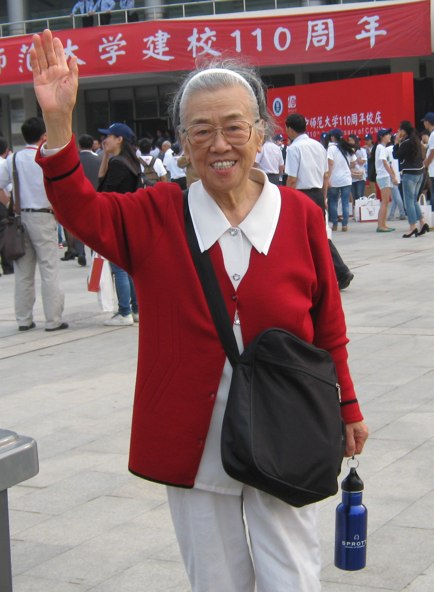1953年教育系本科毕业学子易兰荪来信:华师大110岁生日。母校望儿归。我八十多岁了啊,竞独自一人不顾安危从渥太华飞汉了。为了赶母校校庆。我七点左右就坐在D区易兰荪座位上了。但在与外孙临别时,外孙赠了我一个他的大学奖品记念杯。他也是学生会工作人员之一。深爱母校。百般辛劳的学子啊。十月二号,因我很早就到了母校体育馆。故接到善良志愿者一瓶水和两支香蕉。我将水灌入了我外孙的记念杯中。后来开会时放在椅下。散会匆忙集合忘了拿啊!