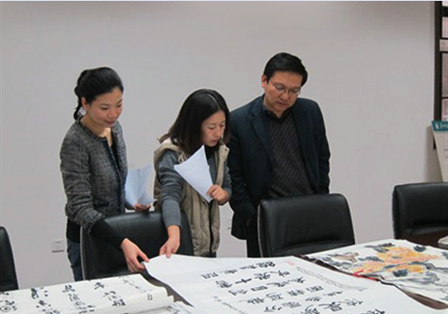 11月18日下午,在华中师范大学行政楼附楼二楼会议室开展了“华中师范大学首届‘爱我华师’校友书画展”的评选活动。参与评选的有校友会发展办吴敬东主任、校友会发展办公室代薇老师和来自美术学院的评委袁慧华、